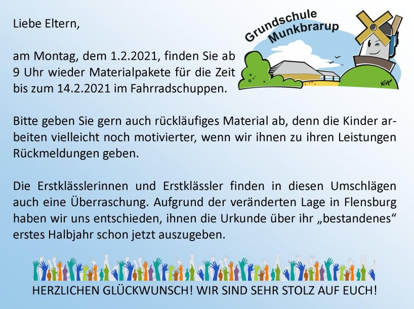 Die Grundschule Munkbrarup ist eine mehrzügige Grundschule des Amtes Langballig östlich von Flensburg. Wir haben zurzeit etwa 180 Schülerinnen und Schüler, die von 18 Lehrkräften in 9 Klassen unterrichtet werden.