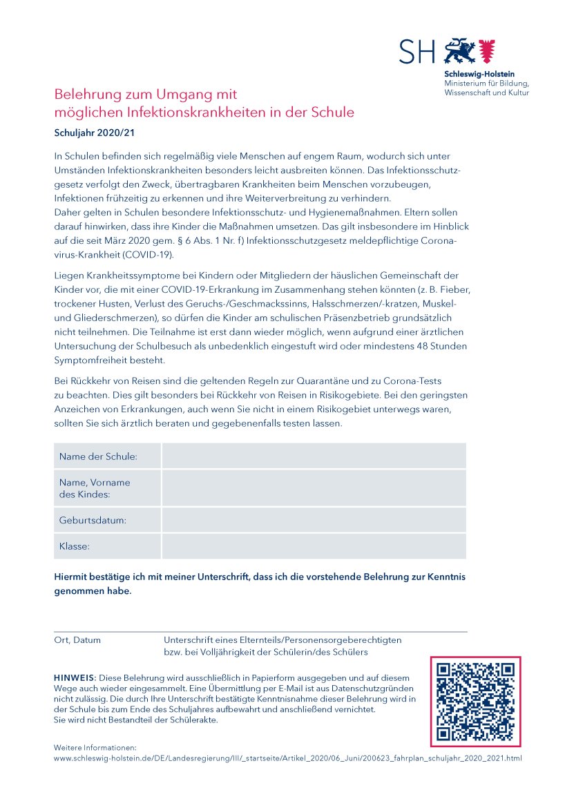 Im Downloadbreich (unten) finden Sie das Belehrungsformular des Ministeriums. Wir möchten Sie bitten, dieses Formular auszudrucken und Ihrem Kind ausgefüllt zum Schulstart mit in die Schule zu geben. Sollten Sie nicht diese Möglichkeit haben, so erhält Ihr Kind das Formular selbstverständlich von der Klassenlehrkraft.