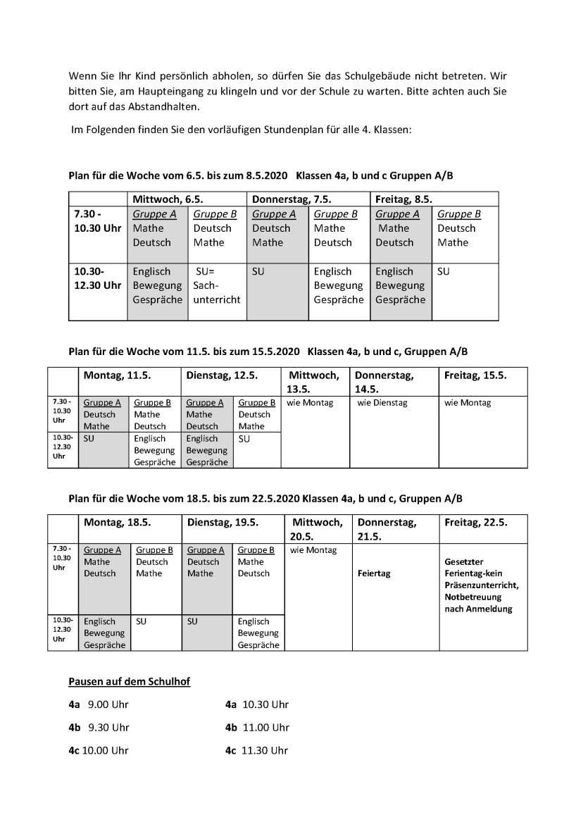 Unterricht für die 4. Klassen ab 6. Mai 2020!
