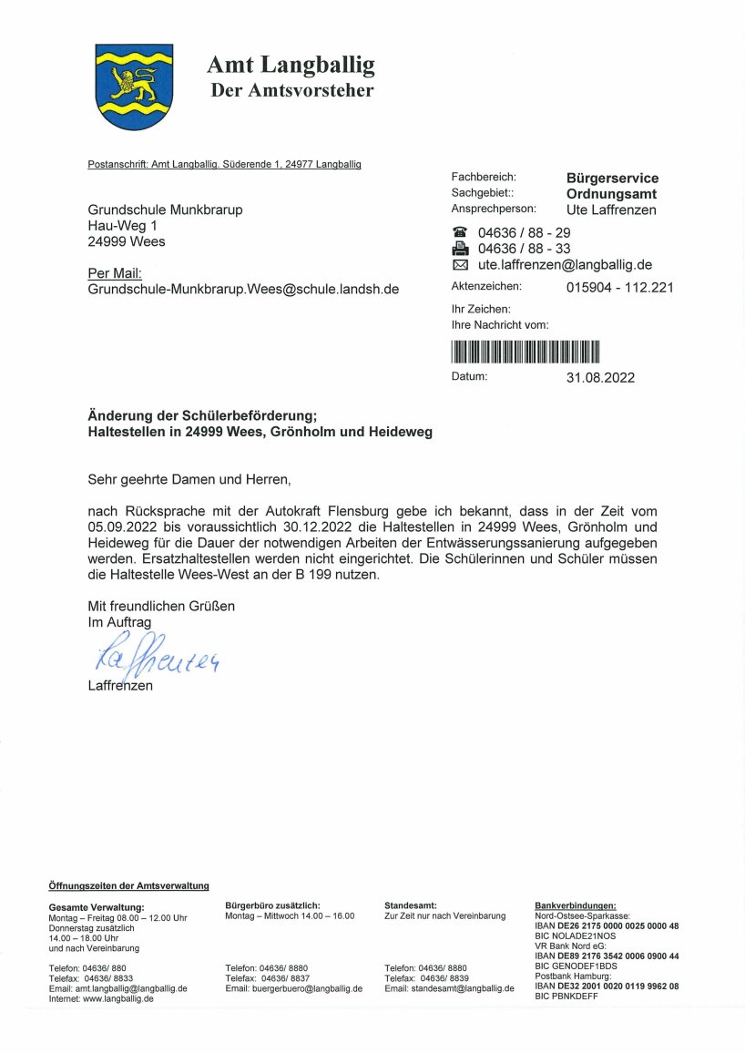 Hier die Infos des Amtes Langballig (vom 31.08.2022): Info!